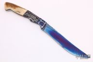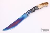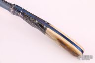 This Fighter from PJ Ernest features a blued Damascus blade with fileworked spine, .155" blade stock and 1.342" blade depth, full tang construction. The handle is comprised of blued mosaic Damascus bolsters and mammoth tooth and mammoth ivory scales with black and nickel silver spacers and black liners. Has a few light scratches, otherwise excellent condition.