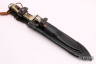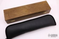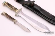 This Puma Super Set features two fixed blade knives and the original leather sheath. The set contains both a Waidblatt and a Kleiner Jagdnicker model. They feature satin finish blades, nickel silver guard and pommels and stag scales over brass and black fiber liners and full tang construction. Has some light staining on the larger blade, otherwise this set is in excellent condition. Comes with a zippered case and original wooden box and papers.
