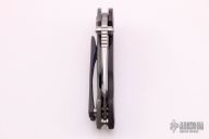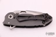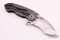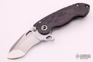 This Mini Solo Flipper by Direware features a satin finished blade with notched thumbrest and a flipper. The handle has a black/purple fat carbon and tumbled titanium frame and tip up clip, titanium pivot and barrel spacers. Comes with original box. Rides on bearings, nice detent, lockup and blade seating. Excellent condition.