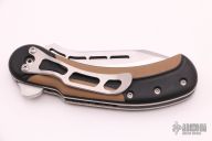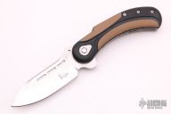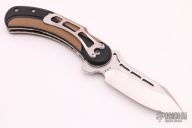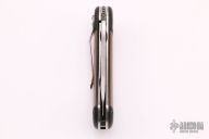 This Field Marshall by Todd Begg features a hand rub satin finished blade with a notched thumb ramp. The handled features black and brown G10 handled over a cracked ice titanium liners with a matching pivot collar, tip down stainless steel pocket clip and a black G10 backspacer. Light scratched are visible on the pocket clip otherwise the knife is in excellent condition. Runs on IKBS bearings. Nice detent, lockup and blade seating. Comes with a zippered case.