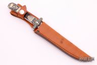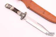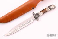 This knife by Parker Cutlery Co features a satin finished blade with "My Country, My Steel, Its Protection" etched on the blade, false top edge, .147" blade stock and 1.001" blade depth, full tang construction. The handle has fancy cast nickel silver bolsters front and rear, stag scales. Comes with original box and brown leather sheath. Excellent condition. #152