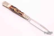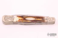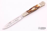 This Big and heavy lockback with "I Never Fail" and "Rough and Ready" engraved on the blade. Nickel silver engraved bolsters, jigged bone scales, brass liners, stainless steel backspacer. Comes with original box. Excellent condition.