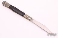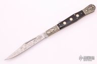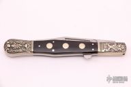 This Big and heavy lockback with "Draw Me Not in Haste" engraved on the blade. Nickel silver engraved bolsters, buffalo horn scales, brass liners, stainless steel backspacer. Comes with original box. Excellent condition.