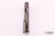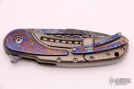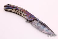 This Full Custom Bodega flipper by Todd Begg features a blued Damascus blade with a false top edge. The handle has an anodized and cracked ice finished titanium frame with MokuTi inlays with cracked ice finished titanium backspacer, MokuTi tip up pocket clip with ball bearing. Includes IKBS (Ikoma-Korth Bearing System) for smooth and fast opening that requires no wrist action. Outstanding work. Excellent condition. Includes a zippered case. This knife was featured on the TV Show "Blade Brothers" and showed Todd making this knife.