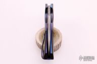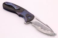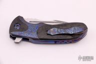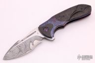This Rex Flipper by Jeremy Krammes features a San Mai Damascus blade with blasted fullers, notched thumbrest and flipper. The handle has carved marble carbon fiber and zircuti scales, anodized titanium liners, zircuti backspacer and tip up clip with hidden screws, anodized titanium hardware. Nice detent, lockup and blade seating, rides on bearings. Comes with original box. Excellent condition.