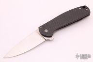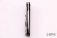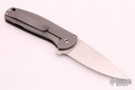 This Jasmine flipper by Ray Laconico features a satin finished blade with flipper. The handle has a carbon fiber and tumble finished titanium frame, carbon fiber backspacer and tip up titanium clip, lanyard hole at the butt. Nice detent, lockup and blade seating. Excellent condition. Comes with a zippered case.