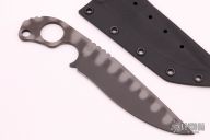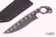 This XL SLCC by Mick Strider features a tiger stripe drop point recurve blade with a notched thumbrest, .198" blade stock and 1.496" blade depth. The handle has a finger groove and ring. Comes with a kydex sheath. New from maker at the 2021 USN Gathering.