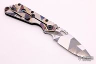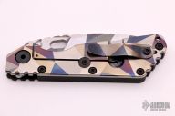 This SMF framelock folder by Mick Strider features a laser engraved Battleship Camo blade and a black FWP aluminum and laser engraved Battleship Camo titanium frame and tip up titanium clip. Includes a "Lock Bar Stabilizer" for maximum reverse lock retention. Nice detent, lockup and blade seating. New from maker at the 2021 USN Gathering.
