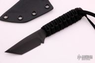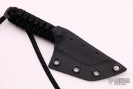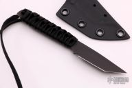 This neck knife by Strider features a black tanto blade with .069" blade stock and .833" blade depth, full tang construction with black cord wrapped handle. Comes with a kydex sheath. Excellent condition.