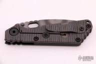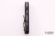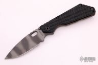 This SNG framelock folder by Mick Strider features a tiger striped blade and a dimple pattern black G-10 and flamed titanium frame and tip up titanium clip. Includes a "Lock Bar Stabilizer" for maximum reverse lock retention. Nice detent, lockup and blade seating. New condition.