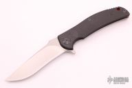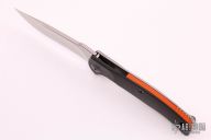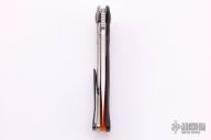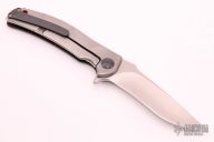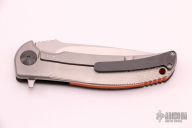 This Q-36 framelock flipper by RJ Martin features a tumble finished, recurve S110V blade with notched thumbrest and a flipper. The handle has a milled carbon quartz and blasted titanium frame, zirconium tip up clip, pivot and screws, orange G10 backspacer. Precision roller thrust bearings give the knife a very fast and smooth opening. Nice blade seating, detent and lockup. Excellent condition.