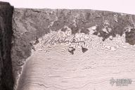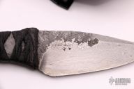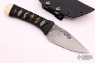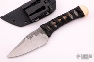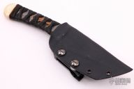 This knife by David Mirabile features a brute de forge Damascus blade with false top edge and forge finished flats and tang, .196" blade stock and 1.374" blade depth, full tang construction. The handle has black cord wrap with walrus ivory menukis and walrus ivory butt. Comes with a leather lined kydex sheath with small TekLok. Excellent condition. Really nice looking knife, just wish I knew who made it.