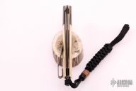 This Urban Trapper Flipper by Brad Zinker features a Mike Norris Fireclone Damascus blade with checkered thumbrest and flipper. The handle has dovetailed Damascus bolsters, mammoth ivory scales, anodized titanium liners with laser engraved interiors and a tip up anodized titanium clip, has a fileworked Damascus backspacer with lanyard hole. Rides on bearings, nice detent, lockup and blade seating. Comes with zippered case. New from maker at the 2021 USN Gathering.