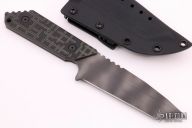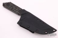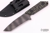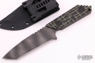 This knife by Strider Knives features a tiger stripe tanto blade with notched thumbrest, .189" blade stock and 1.556" blade depth, full tang construction. The handle has milled black/green G-10 scales, lanyard hole. Comes with a kydex sheath with TekLok. Excellent condition.