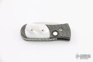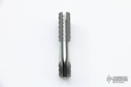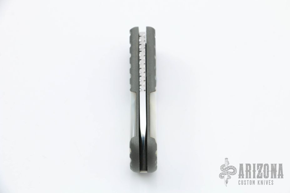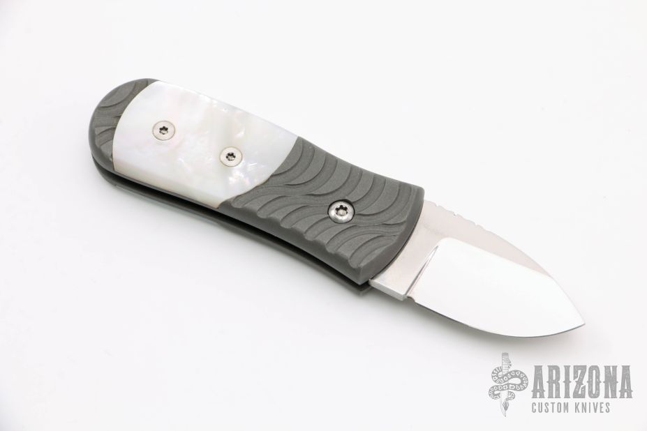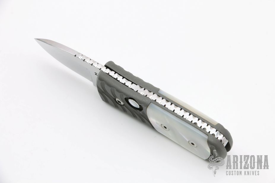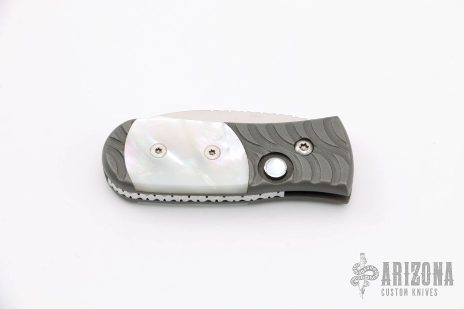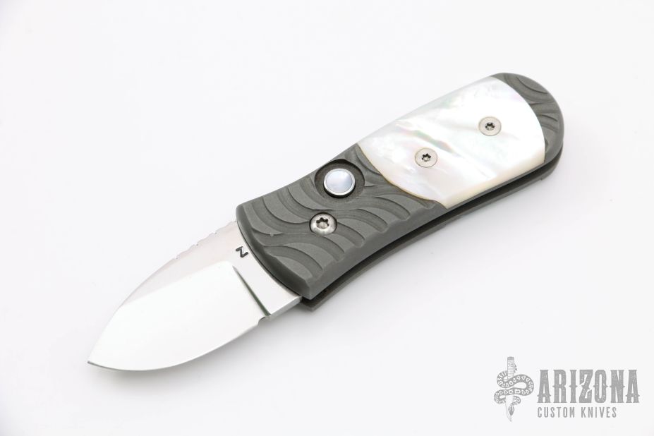 This Butter Bean Coil spring auto by Z Custom knives features a mirror polished blade. The action is fast and strong. Filework on blade spine and stainless steel backspacer. Bead blast titanium frame is milled and has mother of pearl inlays on the frame and push button. The Butter Bean is the smallest automatic from Chris English and the perfect size for every day carry. Excellent condition.