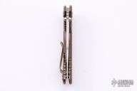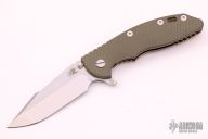 This Skinny XM-18 3.5" flipper by Rick Hinderer features a stonewashed blade with notched thumbrest and flipper. The handle has an anodized and stonewashed titanium frame with a green G-10 scale, a tip up or down reversible titanium clip and filler tab, lanyard hole at the butt. Excellent condition. Comes with original box and extra hardware.