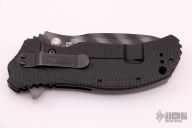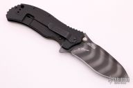 This 0301 frame-lock assisted flipper by Zero Tolerance features a recurve spear-point blade with a tiger stripe finish, stainless steel liner green G10 scale, and black titanium scale with a black G-10 back-spacer. It also features the Speed-safe assisted opening system. Tumble finished black stainless steel clip and lock bar stabilizer. Clip is 4-way reversible. S/N 15055. Looks like it was resharpened, otherwise excellent Condition. Comes with ZT zippered case, box and papers.
