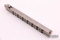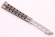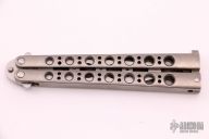 This trainer by Benchmade is sized and weighted to similar style balisongs but without sharpened edges. Stonewashed titanium handles with t-latch. Ideal for becoming accustomed to the operation of a balisong before using one with an edge. Comes with original box and papers. Has a scratch and ding on the ricasso, otherwise excellent condition. This knife is miss marked as a "42T" on the ricasso and is a very early production, less than 50 are like this one.