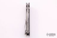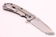 This Hinderer Designed 0561 Framelock Flipper has a stonewashed drop/ spear point blade with swedge, notched thumb rest, dual thumb studs and flipper. The handle has a custom carbon fiber scale and titanium frame- with stainless steel lockbar insert and lockbar stabilizer. Stainless steel clip is tip up. Dead center blade seating, flips like a champ, and has rock solid lockup. Extremely well-made piece, #9317. Comes with original box and papers. Excellent condition.