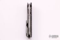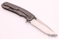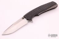 This Daboia by Custom Knife Factory features a satin finished blade with notched thumbrest, fullers, dual thumbstuds with tritium insert and a flipper. The handle has a textured carbon fiber scale, gray coated titanium frame and backspacer with lanyard hole at the butt, tip up matching titanium clip with tritium insert. Has ceramic bearings and a stainless steel lockface insert. Comes with nylon velcro case. Excellent Condition.