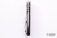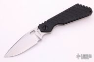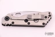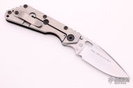 This Mick Strider SMF Fatty framelock folder features a stonewashed blade with thumbhole and notched thumbrest. The handle has a black aluminum and stonewashed titanium frame with titanium clip, tip up carry. Jimping on blade spine. Nice lockup, detent, and blade seating. New condition. NSN: 1095-01-531-5015