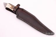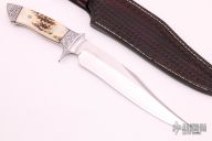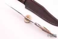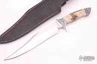 This fighter by Shawn Smith features a mirror polished blade with false top edge, .240" blade stock and 1.586" blade depth, full tapered tang construction. The handle has a engraved stainless steel bolsters, stag grip with red and black spacers/liners, engraved tang spine. Comes with a hand tooled brown leather sheath and a hand carved wooden display box with brass latch (the tab part of the latch is broken). New from maker.