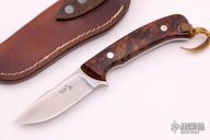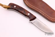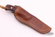 This custom knife by Keith Murr features a drop point blade with a fileworked thumbrest, .139" blade stock, .983" blade depth, full tang construction. The handle has rosewood burl scales with black liners. Great feel in the hand. Very nice work. Excellent  condition. Includes a brown leather sheath.