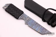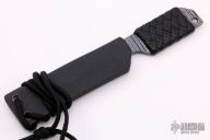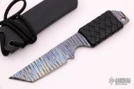 This knife by Mick Strider features a flame anodized titanium chisel ground blade with black leather wrap, .119" blade stock and .960" blade depth, full tang construction. Comes with kydex sheath. Excellent condition.