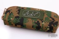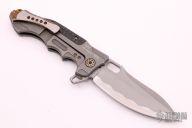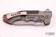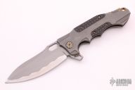 This ADV Hummer framelock flipper has a bead blasted/satin finished blade with swedge, thumbhole, notched thumbrest and flipper. Handle has a dark tumble finished titanium frame with carbon fiber inlays, titanium backspacer with GITD insert, and tip up clip. Nice smooth action, detent, lockup and blade seating. Comes with zippered case. Has scratches, otherwise good condition.