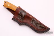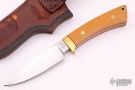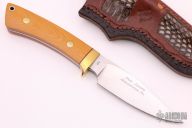 This knife by JD Ware features a hand rub satin finished blade with .185" blade stock and 1.141" blade depth, full tapered tang construction. The handle has a brass guard, yellow paper micarta scales with red liners and brass pins. Comes with a brown leather sheath with snake skin inlay. #019 on the blade. Has some scratches and pitting spots, otherwise good condition.