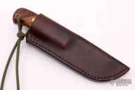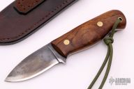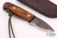 The Small Skinner by Lucas Forge is one of only four made, it features a drop point blade with .122" blade stock and 1.240" blade depth, full tang construction. The handle has wood scales with brass pins. There is a lanyard hole towards the butt of the handle. Includes hand stitched brown leather sheath with belt loop. Excellent condition.