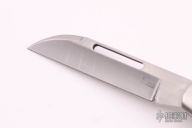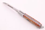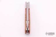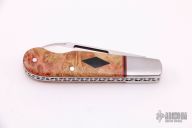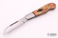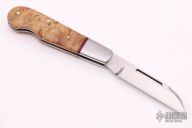 This slipjoint by K'roo Knives features a hand rub satin finished blade with nail nick. The handle has satin finished stainless steel bolsters and liners, maple burl covers with red G-10 liners, red/black G-10 spacers, black G-10 escutcheon, and a fileworked stainless steel spring. Has half-stop, flush in all positions. Has a couple scratches, otherwise good condition. Comes with a zippered case.