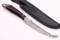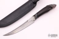This knife features a Damascus upswept blade, .233" blade stock and .995" blade depth, hidden tang construction. The handle has a silver guard and butt with a carp's head, with an ebony wood grip. Comes with a black leather sheath.  The tip of the blade is rolled over otherwise the knife is in excellent Condition.