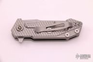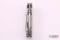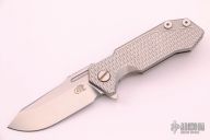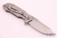 This Half Track from Hinderer Knives features a stonewash finished blade with swedge, fullers, notched thumbrest and flipper. The handle is comprised of a tumbled titanium frame over barrel spacers. Titanium clip is positioned for tip up, right hand carry. Includes the original box and papers.  Excellent Condition.