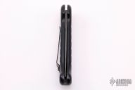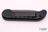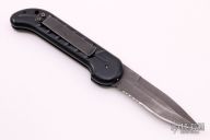 This Ox Enterprises / Charles Ochs coil-spring automatic features a black finished partially serrated blade and black anodized aluminum frame. Black stainless steel clip, tip up carry. Strong and fast opening. Nice function. Has some scuffs and scratches, otherwise good condition. Comes with original box and card.