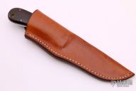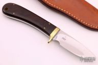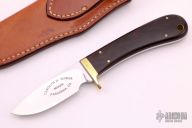 This drop point hunter by Carolyn Tinker features a mirror polished blade with .132" blade stock and .919" blade depth, full tang construction. The handle has a brass guard with wood scales and brass pins. Comes with a brown leather sheath. Has some light scratches, otherwise excellent condition. "C 263" on the b-side of the blade.