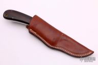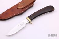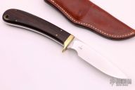 This drop point hunter by Carolyn Tinker features a mirror polished blade with .167" blade stock and .911" blade depth, full tang construction. The handle has a brass guard with cocobolo scales and brass pins. Comes with a brown leather sheath. Has a light spot on the blade, otherwise excellent condition. "D 258" on the b-side of the blade.