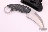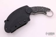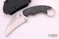 This Karambit by David Mosier features a double edge hawkbill style blade with a full tang construction.  .177" Blade Stock.  1.588" Blade Depth.  The handle features G10 scales a 1" finger hole.  Includes a black kydex sheath and tek-lock.  Sheathing marks are visible on the blade otherwise the knife is in excellent condition.