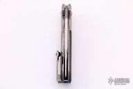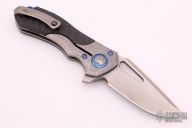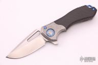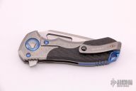 This Protocol Flipper by Marfione Custom Knives features a two-tone stonewash finished blade with notched thumbrest and flipper. The handle has a stonewashed titanium frame with carbon fiber scales, blue anodized titanium backspacer and hardware, tip up bead blasted titanium clip with ceramic ball and hidden screws. Nice detent, lockup and blade seating. Comes with original box and papers. Excellent condition. #009 and dated 12/2019