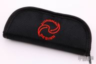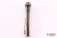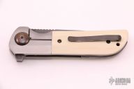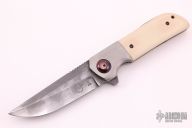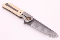 This Warrior One knife was designed by Liong Mah and executed by Jonathan Mcnees, it features an upswept blade with notched thumbrest and swedge, has a nice hamon. The handle has an orange peel finished titanium frame with ivory G-10 scales, zirconium backspacer and tip up clip with hidden screws. Rides on bearings. Nice detent, lockup and blade seating. Comes with nylon zippered case. Has a couple light scuffs, otherwise excellent condition. One of only 12 made.