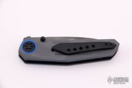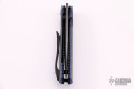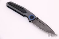 This Pocket Rocket R by Shane Sibert features a Mike Norris Stainless Damascus drop point blade with swedge and dual thumbstuds. The handle is comprised of contoured grey G10 with mill pattern, blue G10 pivot collars and liners. Beadblasted barrel spacers, hardware, and tip up clip. Nice action and detent, the blade favors the right side ever so slightly. Comes with COA dated 03/2021 and zipper case. Excellent condition.