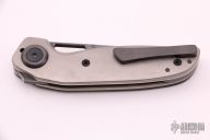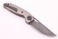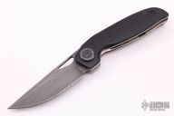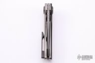 This Transient flipper by Hellion Machine Collective features a Thor Damasteel blade with dark acid etched finish, notched thumbrest and flipper. The handle has a black canvas micarta front scale, tumbled titanium rear scale, tip up zirconium clip with hidden screws, zirconium pivot collar, Damascus and zirconium 3-piece backspacer. Rides on bearings, nice detent, lockup and blade seating. Comes with cloth pouch and COA dated 2017. Excellent condition.