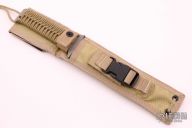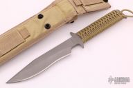 This D9 by Duane Dwyer features a bead blasted recurve blade with false top edge, .252" blade stock and 1.538" blade depth, Integrated double guard with tan cord warp. Comes with nylon tactical sheath. Has some sheath scuffs, otherwise excellent condition.