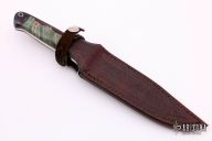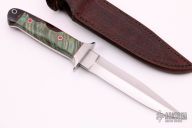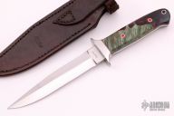 This Fighter by Dave Ricke features a hand rub satin finished double edged blade with .141" blade stock and 1.254" blade depth, full tapered tang construction. The handle has a stainless steel guard and stabilized maple scales with red liners. Comes with a hand tooled brown leather sheath and zippered case. New from maker.
