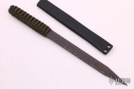 In 1988, he began making specialized knives for use by the military. This turned out to be fortunate turn of events, both for Mick and for the knife using world at large. Mick’s approach was to not get burdened by the weight of past designs. He started with a tabula rasa, a clean slate, informed only by his own experiences and knowledge of what a soldier needed in a knife. The knives he made didn’t look like the hunter-inspired knives seen in most PXs; instead they were almost brutish in their functionality: beefy, solid, and with unbreakable ¼” stock full tangs. These knives were the first indication of his innovative approach: in addition to their utilitarian design, the knives carried a subdued finish and subdued sheaths. No one carrying a Strider knife was going to be spotted because of sunlight glinting off of polished steel or a glossy leather sheath. Soldiers, policemen, and other men going into harm’s way couldn’t buy them fast enough. Mick sampled some good ideas, but made them great. For instance, he was not the first to wrap a knife handle with paracord, but he was the first to do it in a way that was tough enough for sustained infantry use. His knife line grew over the following years to include different varieties of fixed blades, all distinctive and many with specialized uses. But constant in all of them was a disregard for convention, and a desire to try new ideas. An example of this was the Ajax – it featured a very wide blade surface clearly designed to inflict damage. It drew on the weapons carried by Roman legionnaires, yet was modern and usable in the 21stCentury battlefield. Mick also worked on his technical skills, always striving to become better at the physical craft. At the 2002 Blade Show, a group of the best tactical knifemakers in the country decided to compete with each other to produce the most innovative and interesting fixed “battle blade” at the show. Mick’s entry, an incredible integral knife made out of ½” titanium stock with a zippered composite blade, gorgeous handles, and integral guard was the unanimous winner, and effectively retired the competition.