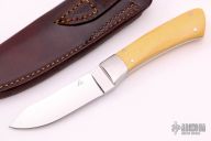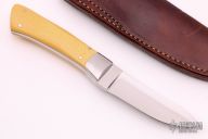 This semi-skinner by Jim Lee features a mirror finished blade, .182" blade stock and .944" blade depth, full tapered tang construction. The handle has stainless steel dovetailed bolsters and yellow paper micarta scales. Comes with a brown leather sheath and a zippered case. Has a few light scratches, otherwise excellent condition.
