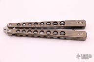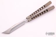 This Top Teir Devil Tanto Balisong by HazeTac features a satin finished milled tanto blade. The handles are made of anodized titanium with matching spacers. Has 440C hardened bolts and bushings for pivots and backspacers. Comes with a black leather belt sheath, zippered case and spanner tool. Has a few light scratches, otherwise excellent condition.