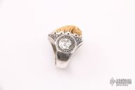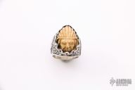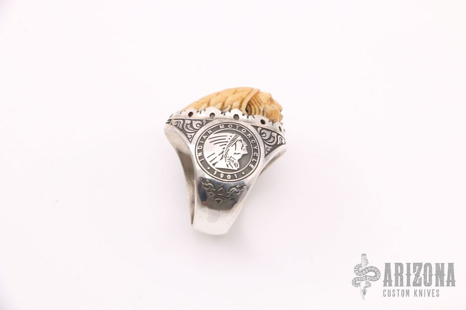 This Ring by Joe Scherhaufer is made of Sterling Silver and has a carved bone head inlay. Engravings are visible on both sides. Size: 10. New from Maker.