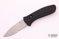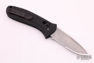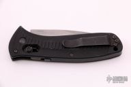 This Mel Pardue designed Ambidextrous Axis Auto by Benchmade allows for automatic opening with either hand by pulling either Axis button back (buttons on each side of the handle). Integrated spine mount safety. Bi-directional machined black aluminum handle grip for a superior sure grip, tip up reversible stainless steel clip. Comes with original box and papers. Has a few light scuffs, otherwise excellent condition.