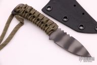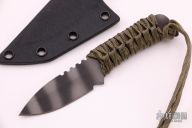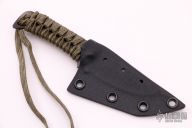 This knife by Mick Strider features a tiger striped blade with paracord wrap, .077" blade stock and .896" blade depth, full tang construction with cord wrapped handle. Comes with kydex sheath. New condition.